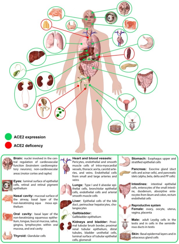 Като цяло високият афинитет на вирусния шип – S протеин към рецептора ACE2 може да понижи нивото на ACE2, да увеличи нивото на Ang II и да намали нивото на Ang1-7, като по този начин стимулира възпалението и белодробната фиброза.